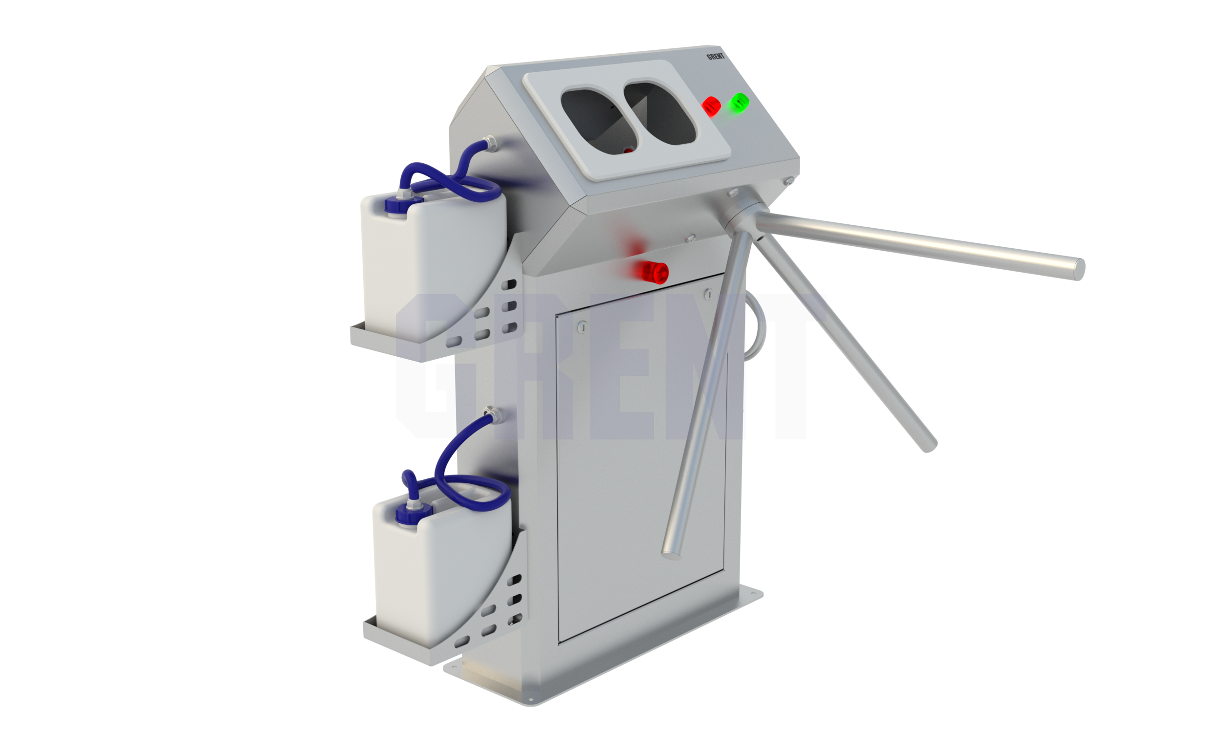 Станция гигиены рук GRENT 012 R предназначена для автоматической бесконтактной дезинфекции кистей рук персонала перед входом в чистую зону. Включение подачи дезинфицирующего средства происходит при поднесении обеих рук в зону срабатывания фотоэлементов, расположенных в дезинфицирующей камере. Дезинфицирующее средство подается автоматически при помощи электронасоса. Распыление дезсредства осуществляют 4 форсунки, расположенные в верхней и нижней части дезинфицирующей камеры, что обеспечивает обработку рук с двух сторон